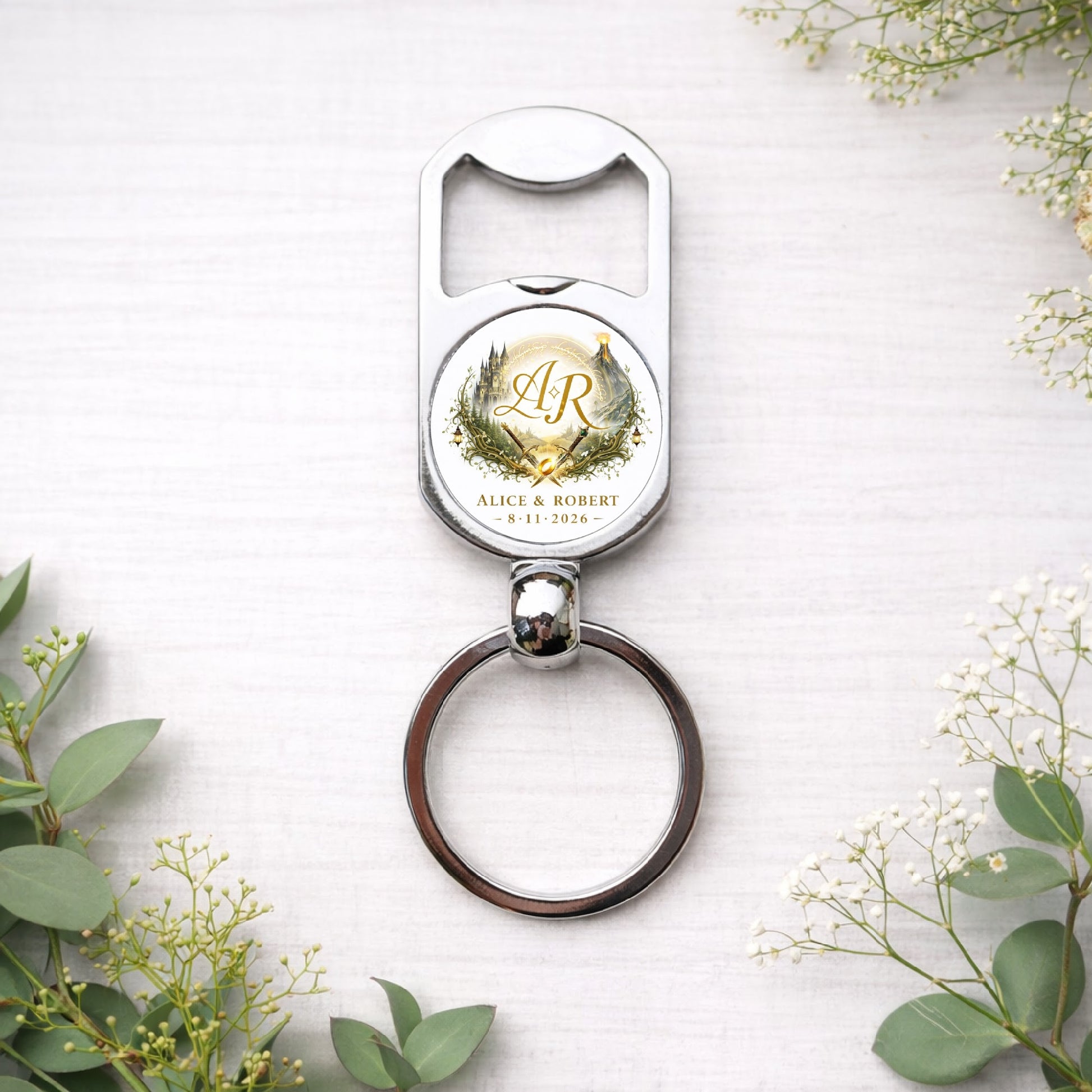 Personalised Wedding Logo Bottle Opener Keyring – Custom Wedding Favour Gift for Bridesmaids, Groomsmen & Guests