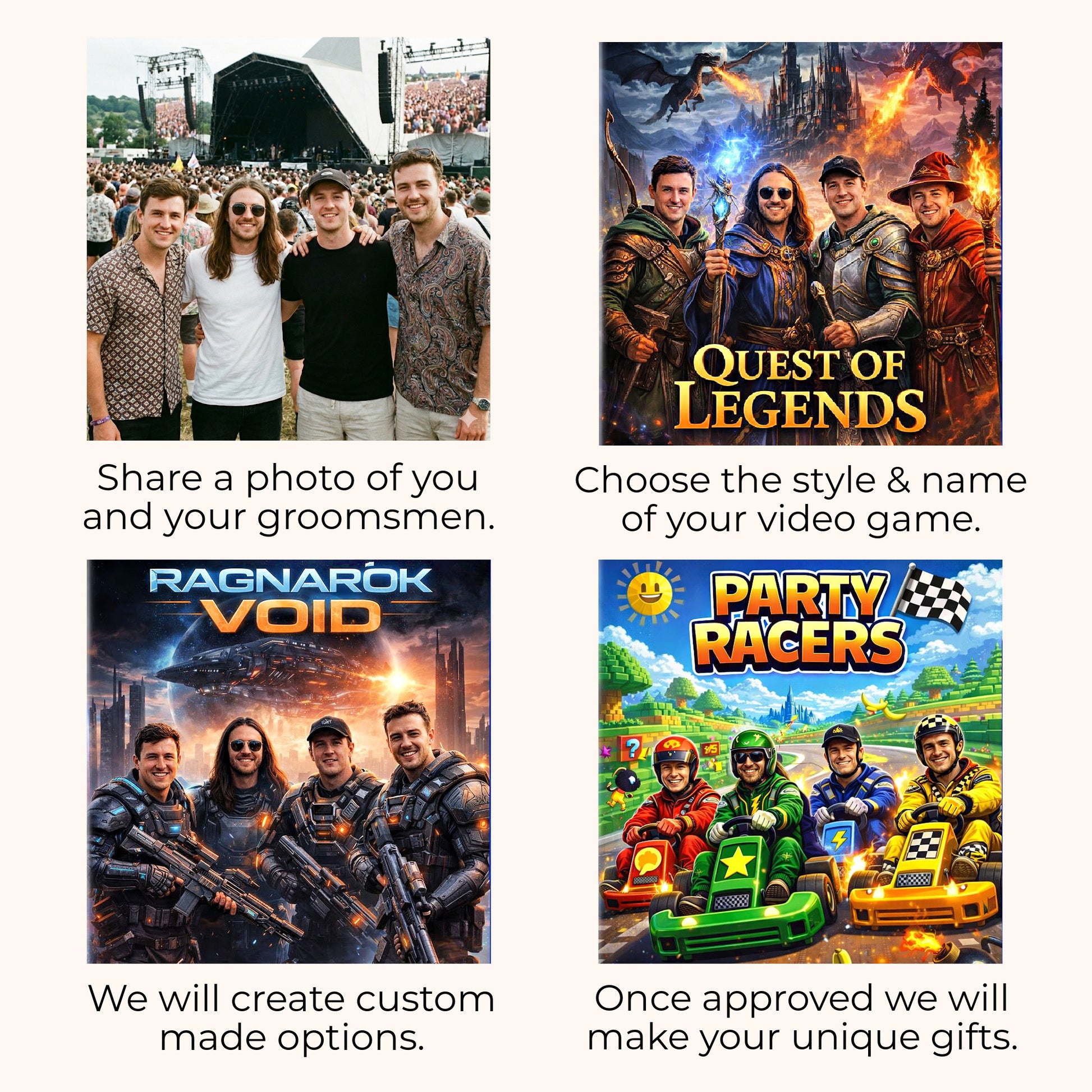 ✔ A photo of you and your groomsmen, transformed into a custom game cover
